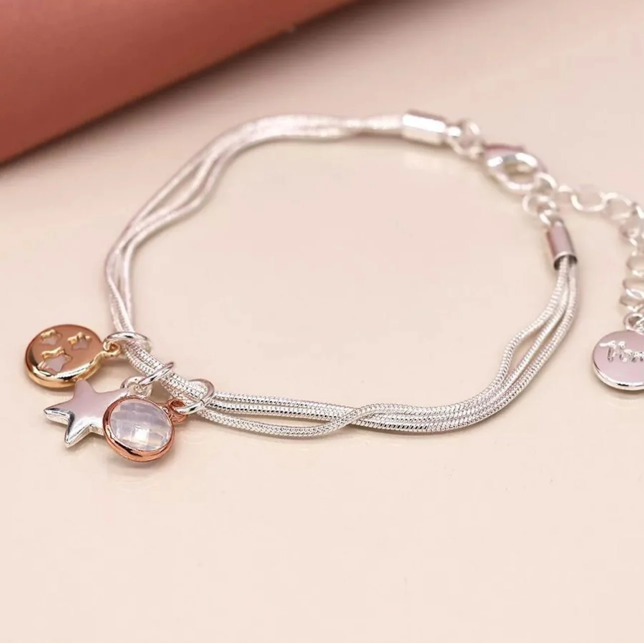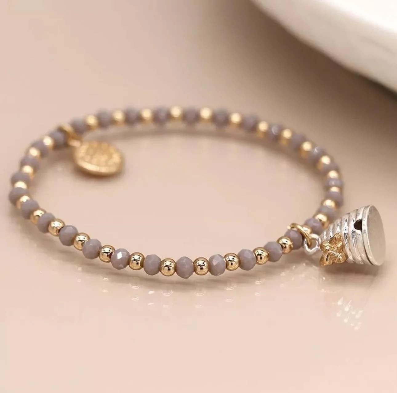 Silver plated ellipse bead stretch bracelet with a golden hammered disc and clear faceted square crystal charm in a golden setting.